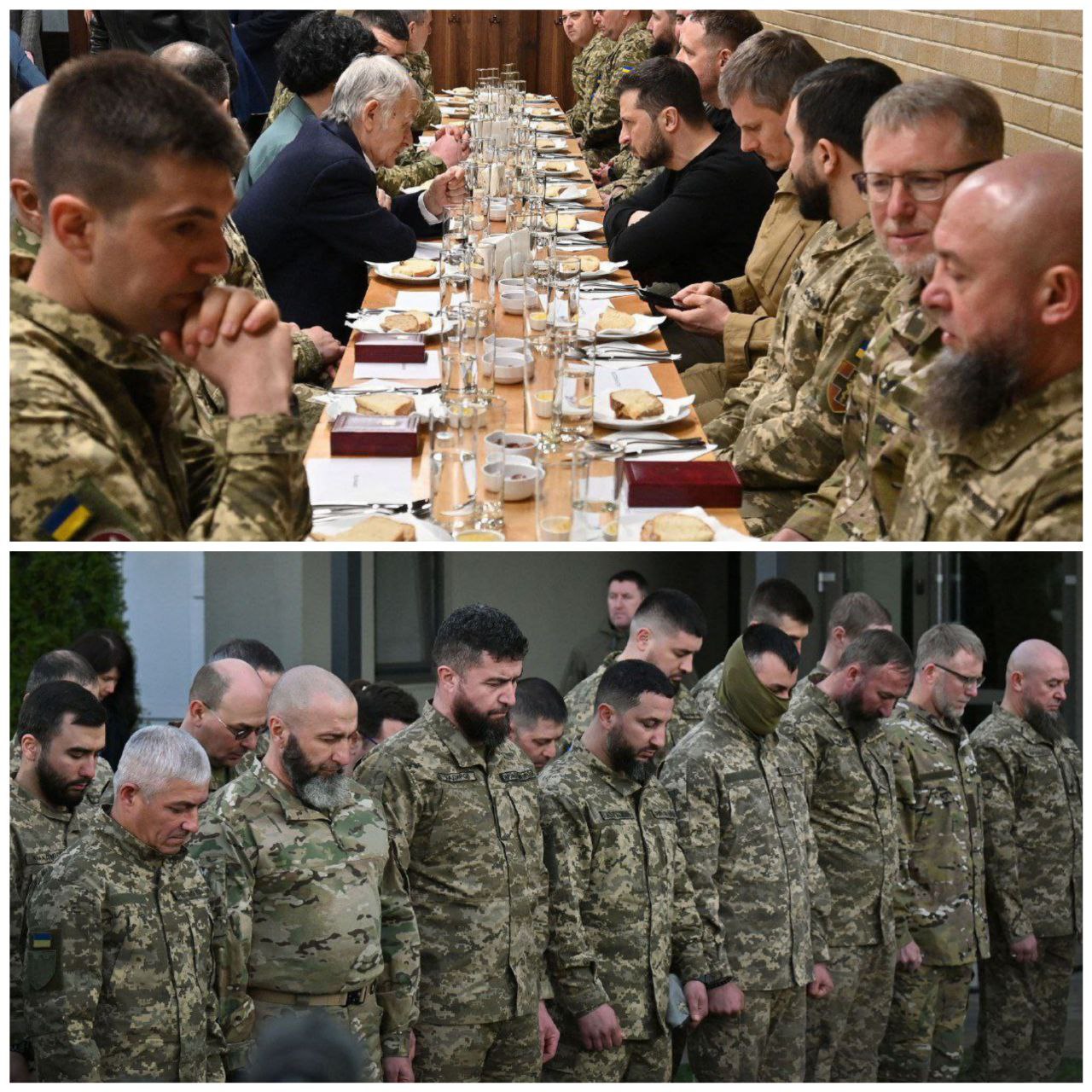 لە وێنە هەواڵێکدا ڤلۆدێمیر زلێنسکی سەرۆککۆماری ئۆکراین بەشداری لە مەراسیمی بەربانگی ڕەمەزان دەکات لەگەڵ سەربازە موسلمانەکانی وولاتەکەی .