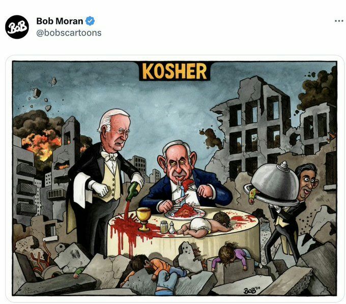 لەم کاریکاتێرەدا ناتانیاهوویەکی خوێنڕێژ لە تەنیشت جۆ بایدن و ڕیشی سۆناک، لە ژێر ووشەی "کۆشێر" (کە بە واتای خواردنی حەڵاڵ لە ئایینی جوولەکەدا) دانیشتووە و بە خواردنی منداڵانی غەززە ئاهەنگ دەگێڕێت.