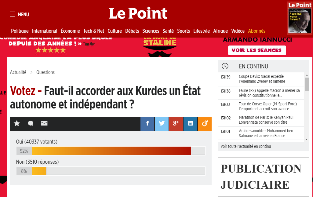 گۆڤاری "لو پوانت" (Le Point) لە ماڵپەڕی فەرمیی خۆی ئەو ڕاپرسییەی ڕاگەیاندووە و بە خستنەڕووی پرسیارێک دەپرسێت (ئایا پێویستە کورد وڵاتێکی سەربەخۆی هەبێت)؟.