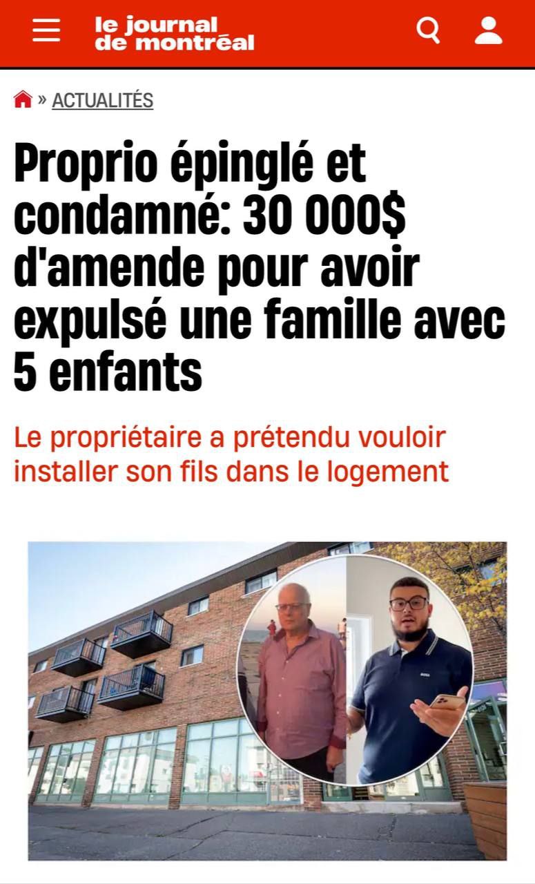 خاوەنی موڵکێکی نیشتەجێبوون لە شاری مۆنتریال بە بیانووی ئەوەی کوڕەکەی دەیەوێت لە ماڵەوە نیشتەجێ بێت، داوای لێبوردنی لە کرێچیەکەی کرد کە پێنج منداڵی هەیە. بەڵام دادوەری دادگای کارگێڕی خانووبەرە لەسەر تاوانی ناپاکی و درۆ و پێشێلکردنی مافی کرێچی بە بڕی ٣٠ هەزار دۆلار غەرامەکردنی بەسەردا سەپاند.