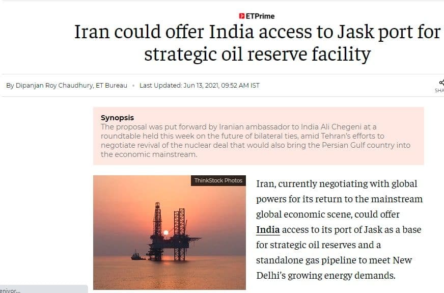 میدیاکانی هیند، ڕاپۆرتێکیان دەربارەی پێشنیاری کۆماری ئیسلامی بۆ ئەو ووڵاتە، بە مەبەستی کڕینی بەندەری جاسک بڵاو کردۆتەوە.
