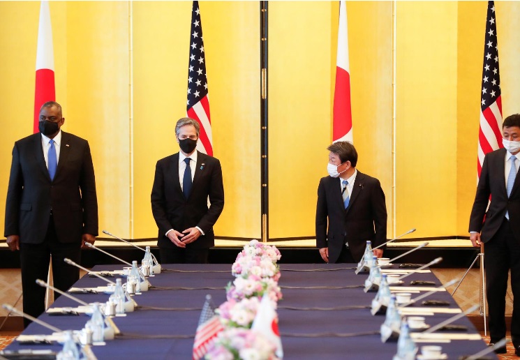 بە پێی ڕاپۆرتێک ئانتۆنی بلینکن وەزیری کاروباری دەرەوەی ئەمریکا لە یەەکەمین سەفەری دەرەوەی خۆی وەکوو وەزیری ئەو ووڵاتە سەردانی ژاپۆن ی کرد و هەڕەشەی لە چین کرد . ئەو داوای لە چین کرد دەست لە ڕەفتارە دوژمنکارانە و هەڕەشە ئامیزەکانی خۆی هەڵبگرێت . ئەمریکا و چین سەبارەت بە بابەتگەلێکی جیاواز لەوانەش دەریای باشووری چین ، سەرچاوەی کۆرۆنا ، موسڵمانانی ئیغوور ، تایوان و هۆنگ کۆنگ لە دەرگیری و کێشە و گرفت دان .