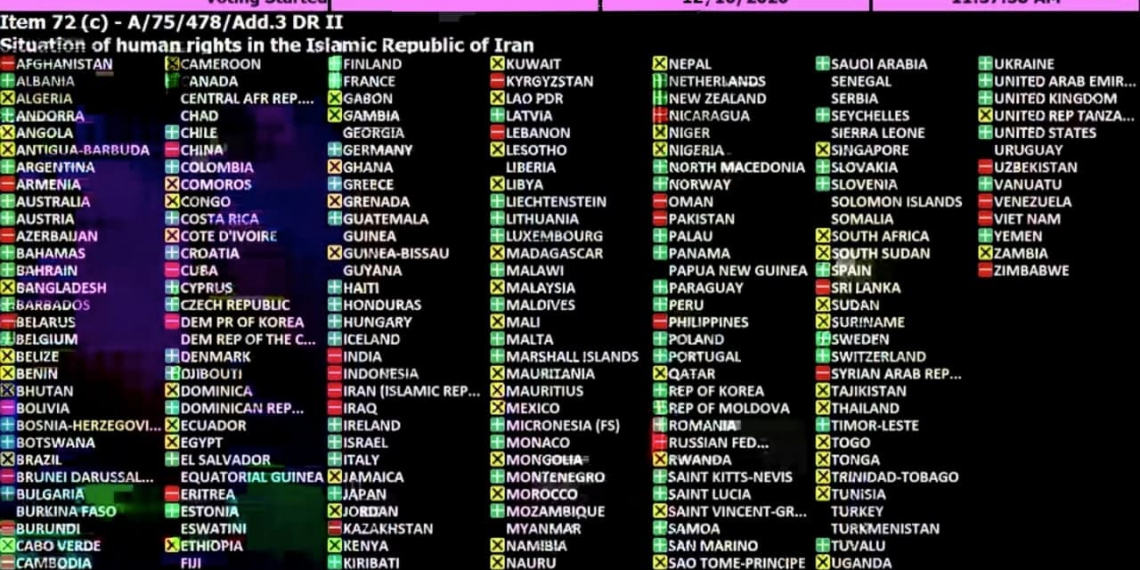 ڕۆژی چوارشەممە ١٦ی کانوونی یەکەمی ٢٠٢٠،، کۆڕی گشتیی ڕێکخراوی نەتەوە یەکگرتووەکان،بە ٨٢ دەنگی ئەرێ و ٣٠ دەنگی نەخێر و ٦٤ دەنگی بێ لایەن، بڕیارنامەی کۆتایی مەحکووم کردنی پێشێلکارییەکانی مافی مرۆڤی لە ئێران بە دژی ئەو ڕێژیمەی پەسەند کرد.