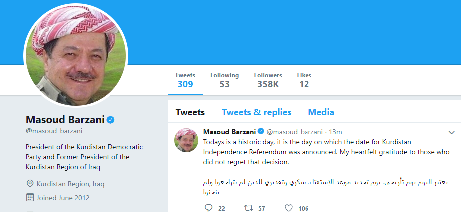 له ساڵڕۆژى بڕياردان لهسهر ئهنجامدانى پرۆسهى ريفراندۆمى سهربهخۆيى كوردستان، سهرۆك بارزانى له تۆڕى كۆمهڵايهتى تويتهر پهيامێكى بڵاوكردهوه.