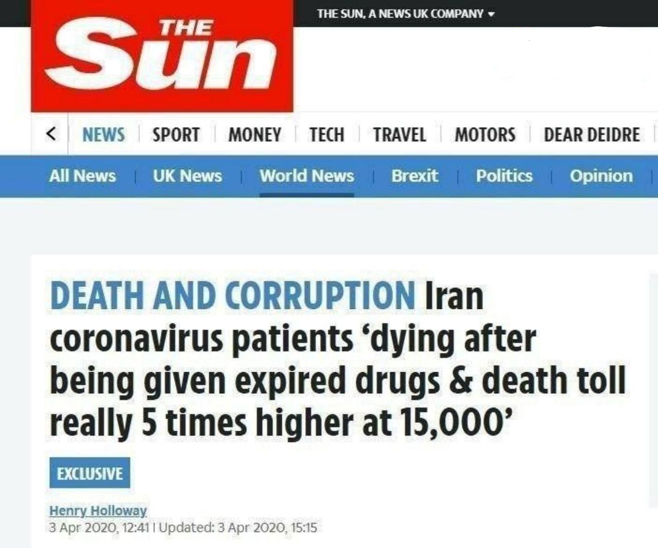 ڕۆژنامەی سان ی بەریتانی لە ڕاپۆرتێکدا سەبارەت بە کۆرۆنا و دۆخی نەخۆشانی تووشبوو بەم ڤیرووسە نووسی : تووشبووانی کۆرۆنا لە ئێران لە دوای بەکار هێنانی دەرمانگەلی ماوەبەسەر چوو و ئێکسپایەر گیانی خۆیان لە دەستداوە
