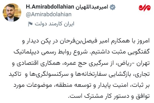بە پێی زانیارییەکان ئەمیر عەبدۆڵلاهییان وەزیری کاروباری دەرەوەی ئێران لە دوای دیدار و چاوپێکەوتنی لەگەڵ هاوتا سەعوودییەکەی ڕایگەیاند ئەمڕۆ لەگەڵ هاوپیشەکەم ئەمیر فەیسەل بێن فەرحان لە پێکەن دیدار و گفتووگۆیەکی پۆزەتیڤ مان هەبوو . دەست پێکردنی پەیوەندی فەرمی دیپلۆماتیکی نێوان تاران – ڕیاز دەستپێکردنەوەی حەج و عەمرە ، هاوکاریگەلی ئابووری و تیجاری ، کردنەوەی باڵیۆزخانەکان و کونسووڵگەرییەکان و جەخت کردنەوە لە سەر سەقامگیری ، ئەمنییەتی پایەدار و بەرفراوان کردنی ناوچەکە ، بابەتگەلی ڕێکەوتن و فەرمانی کاری هاوبەشمانە .