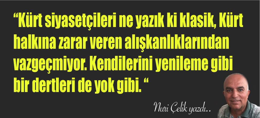 Kürt siyasetçileri ne yazık ki klasik, kronik ve Kürt halkına zarar veren alışkanlıklarından vazgeçmiyor. Kendilerini yenileme, kendilerini aşma gibi bir dertleri de yok gibi. Bu alışkanlıkların aktörleri bir kez daha gündemi belirlemeyi başardılar ve kendileriyle hiçbir zaman dost olmayacak olan AKP’nin ekmeğine yağ sürüyorlar. Kürt sorununda devletin ve AKP’nin belirleyici olması için ellerinden geleni yapıyorlar.