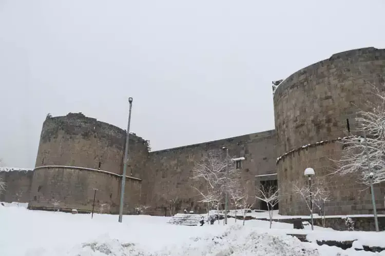 Diyarbakır’da kar yağışı ulaşımı olumsuz etkilerken, beyaza bürünen kentte Sur ilçesindeki UNESCO Dünya Kültür Mirası Listesi’ndeki Diyarbakır Surları ve Hevsel Bahçeleri ile Mardinkapı, Melikahmet Caddesi, Anzele Parkı, Balıkçılarbaşı ve Hazreti Süleyman yerleşkesi karla kaplandı.