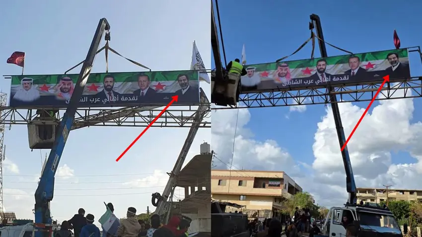 PeyamaKurd- îro 8ê Kanûnê di salvegera rûxandina rejîma Beas a Sûriyê û deshilata Beşar Esed de, wênê Serokê demkî yê Sûriyê Ehmed Şera ligel wêneyê dîktatorê rejîma berê ya Iraqê Sedam Hisên hate daliqandin.