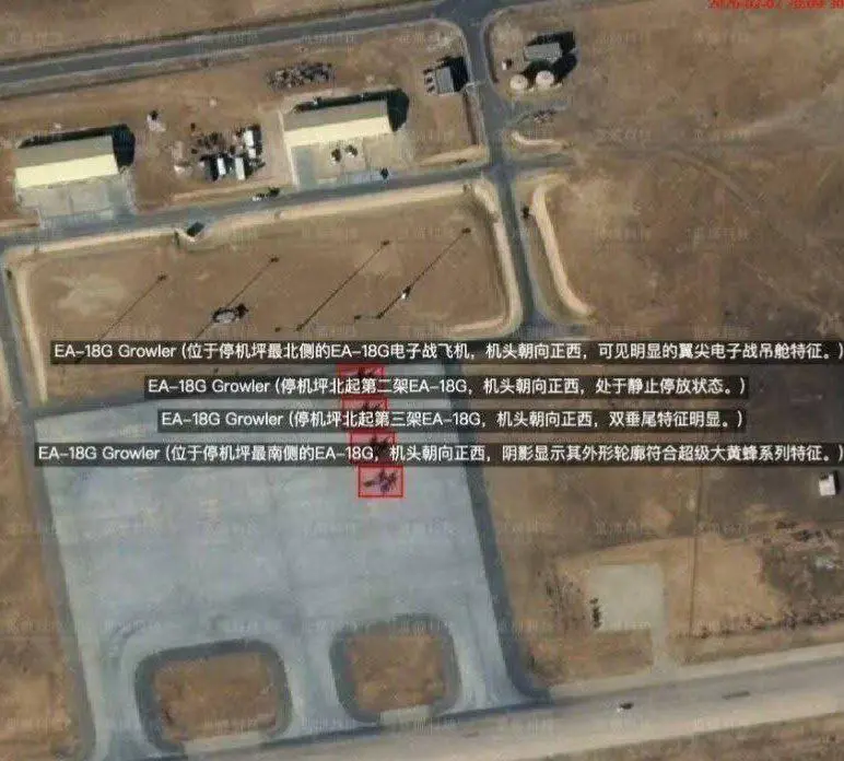 ڕاپۆرتەکان ئاماژە بە بوونی چوار فڕۆکەی جەنگی ئەلیکترۆنی EA-18G Growler لە بنکەی ئاسمانی مەوفەق سۆلتی لە ئوردن دەکەن؛ ئەو فڕۆکەیانەی کە تایبەتمەندن بە جام کردنی ڕادار و شەڕی ئەلیکترۆنی و ئۆپراسیۆنەکانی پشتگیری ئاسمانی