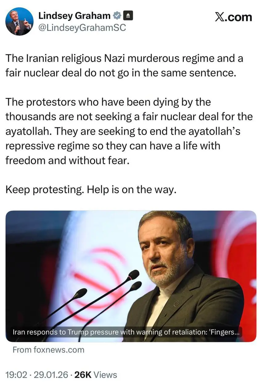 سیناتۆر لیندسی گراهام، یەکێک لە ڕەخنەگرانی کۆماری ئیسلامی، لە پۆستێکی ڕاشکاوانەدا لە تۆڕی کۆمەڵایەتی ئێکس نووسیویەتی "ڕێژیمی مەزهەبی نازی سفەت و مرۆڤ كوژی ئێران" و چەمکی "ڕێكکەوتنی ئەتۆمی دادپەروەرانە" لە یەک ڕستەدا جێگایان نابێتەوە.
